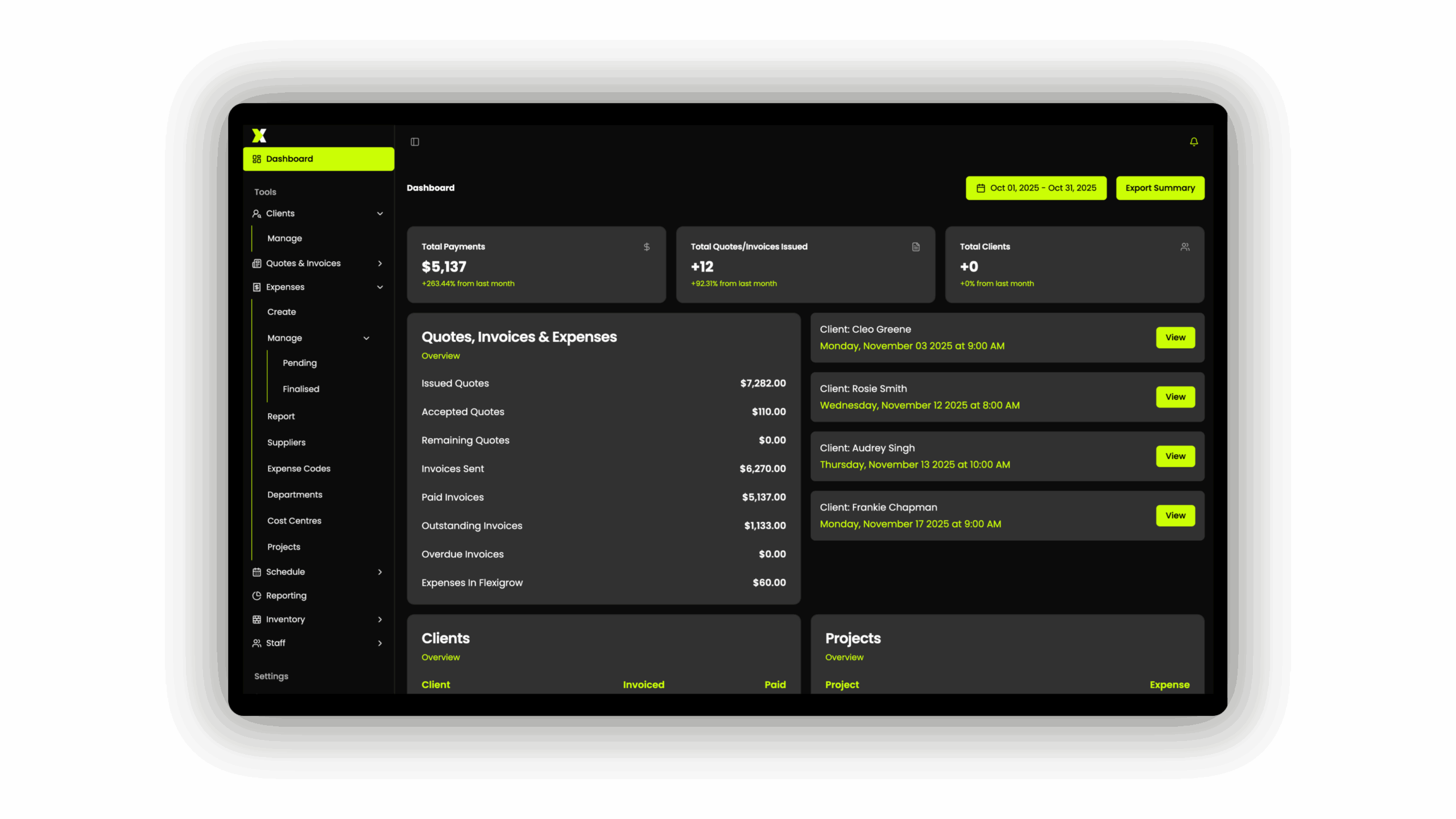 Flexigrow is built to scale with your business, whether you’re a solo contractor or managing multiple teams. You can customise user access, streamline reimbursements, and tailor project workflows as your business grows.